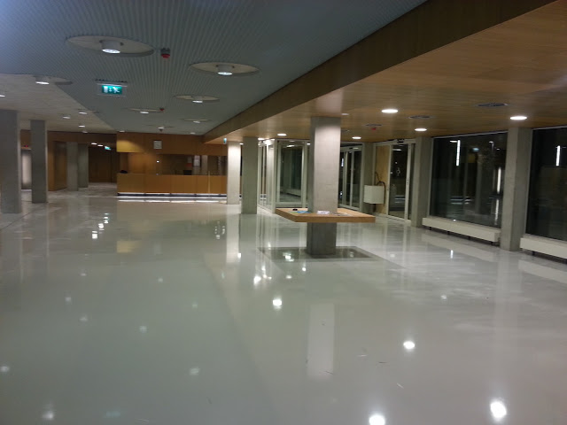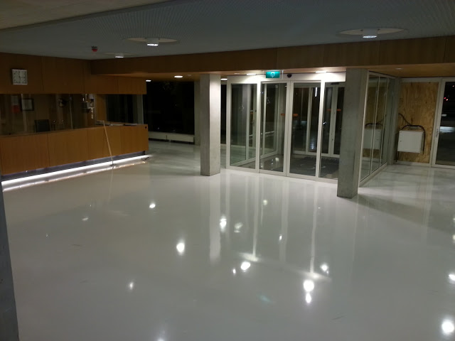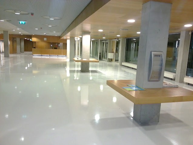 In het zeer strak ontworpen gemeentehuis van Tynaarlo heeft Bescon diverse vloeraanpassingen, reparaties en uiteindelijk een geheel nieuwe kunststof gietvloer aangebracht met een PU en antislip als eindlaag.