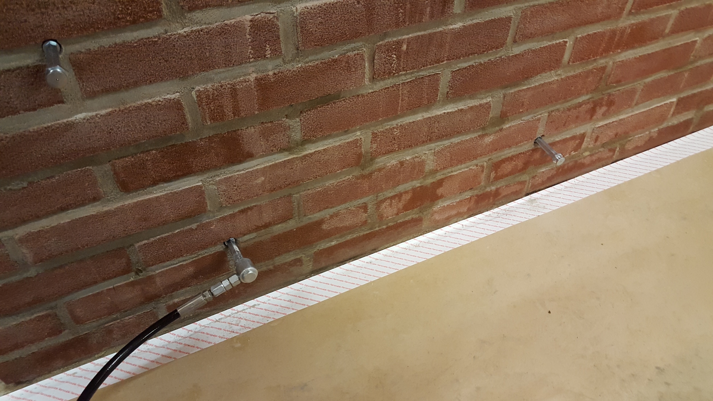 Injectie van gel: een speciale acryl- of polyurethaangel wordt onder gecontroleerde druk geïnjecteerd. De gel dringt door micro-poriën, capillaire scheuren en het zandpakket achter de kelderwand.