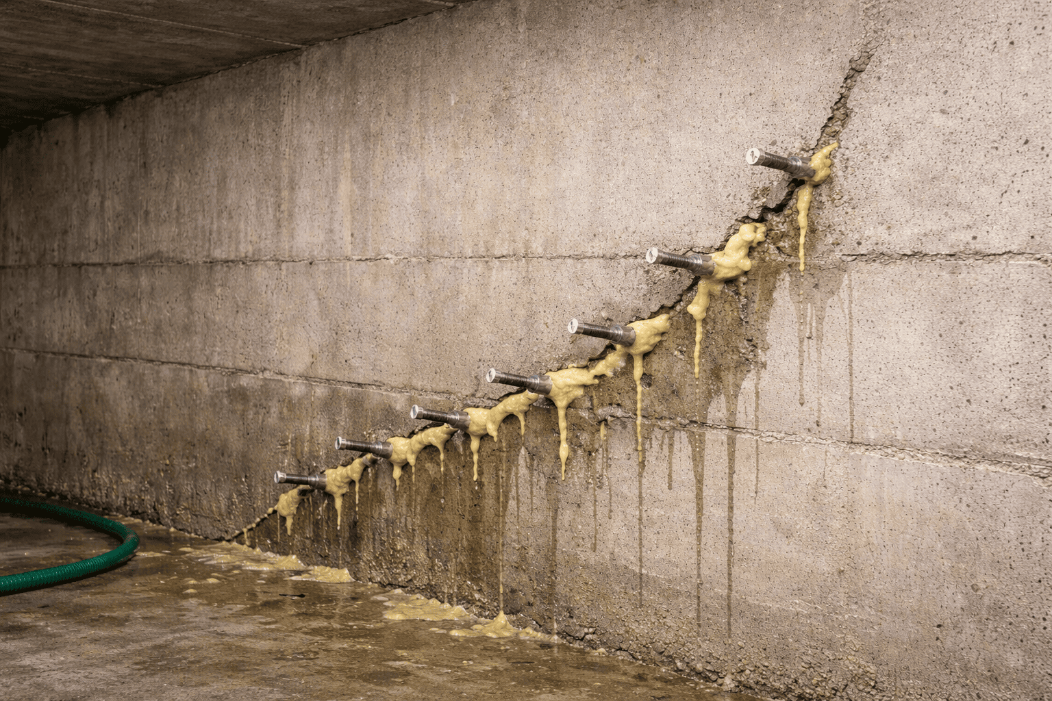 Bij een betonnen kelder met waterinfiltratie of hoge grondwaterdruk kan een gehele kelderinjectie worden uitgevoerd om de constructie effectief waterdicht te maken. Hierbij wordt niet alleen gefocust op zichtbare scheuren, maar op de compleet waterpasserende zones in het beton en het aangrenzende zandpakket.