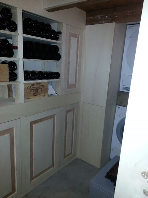 In een woonhuis te Amsterdam is samen met de bewoners een plan bedacht om meer vierkante meters woongenot te creëren. Om dit voor elkaar te krijgen, hebben we de kelderruimte betrokken bij de woonruimte. Deze kelderruimte moest eerst afgedicht worden om er uiteindelijk een wijnkelder van te maken met een koelmeubel voor wijnopslag, waarin bovendien plaats is voor een wasmachine en droger. Boven de kelder is de keuken gesitueerd en de kelder is via de woonkamer te betreden.