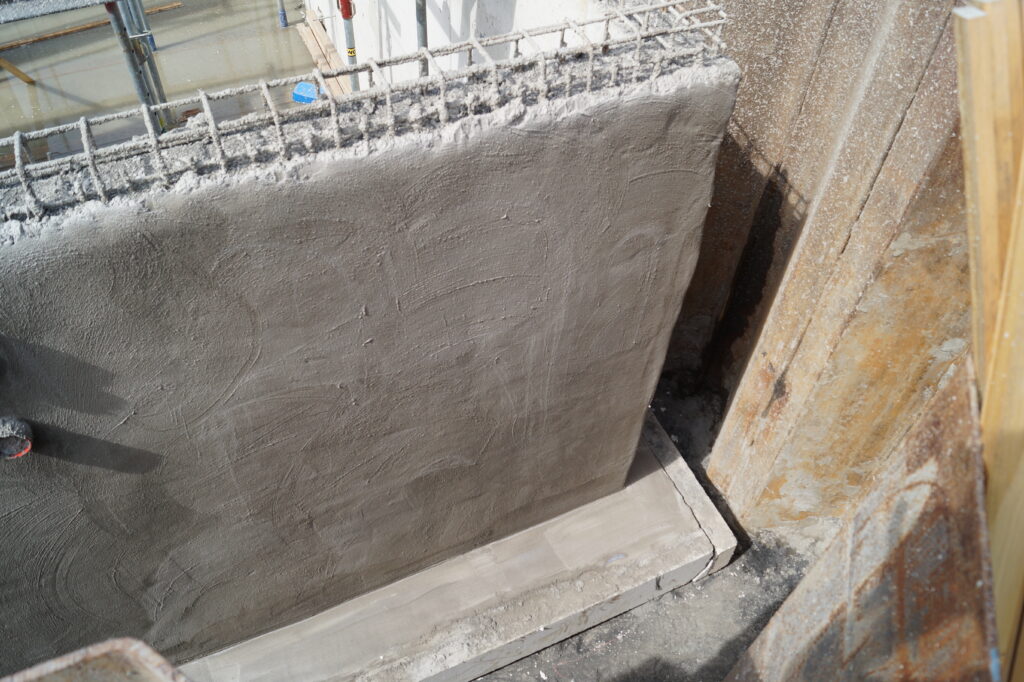 Bescon heeft eerst de ondergrond grondig gestraald met grit waarna er een betonspuit mortel aangebracht werd in 2 lagen. Hierdoor werden de grindnesten weer volledig gevuld met betonspuitmortel en zorgde een extra betonspuit laag van 3 cm¹ voor een volledig waterdichte laag met een garantie van 15 jaar.